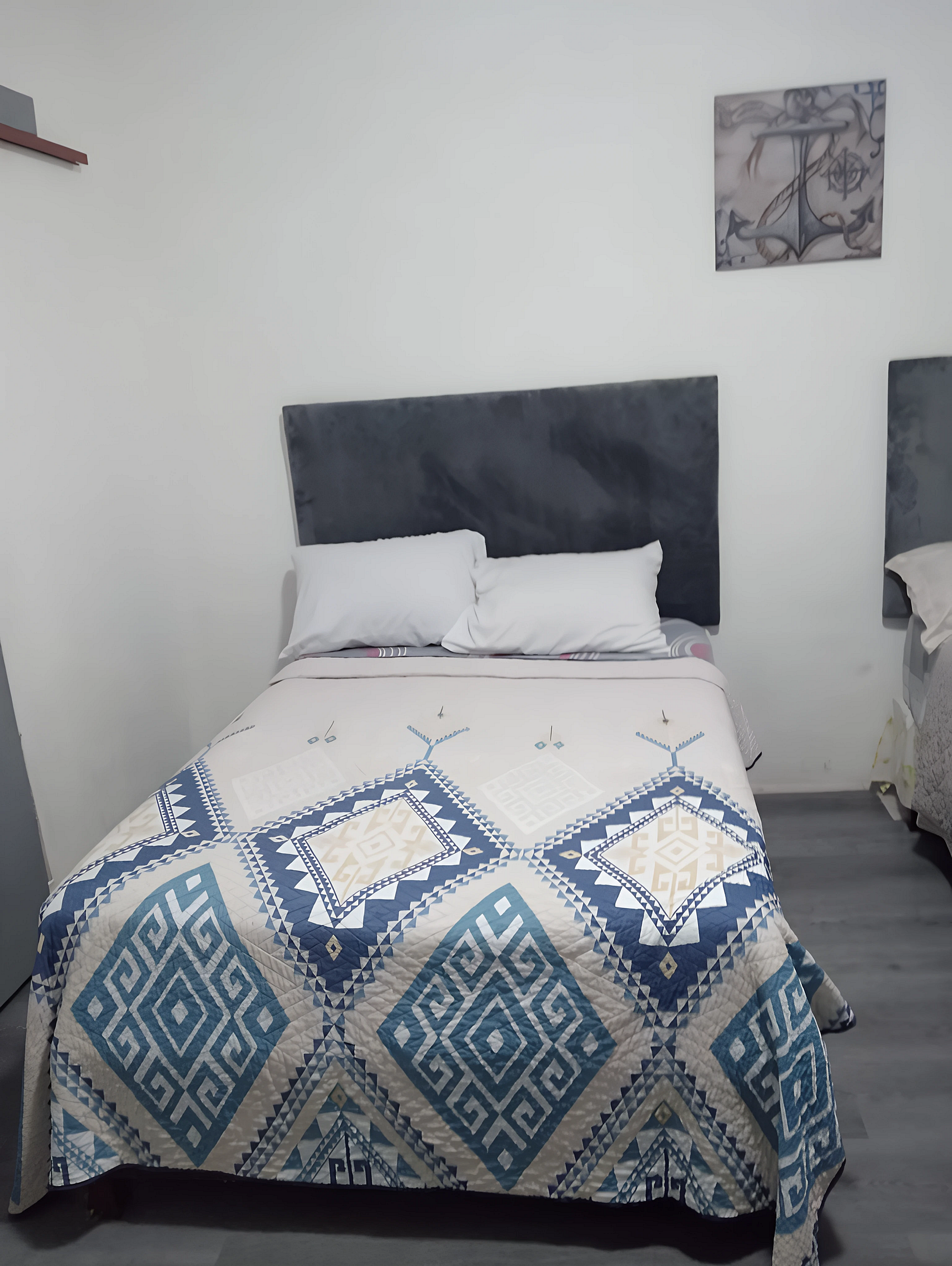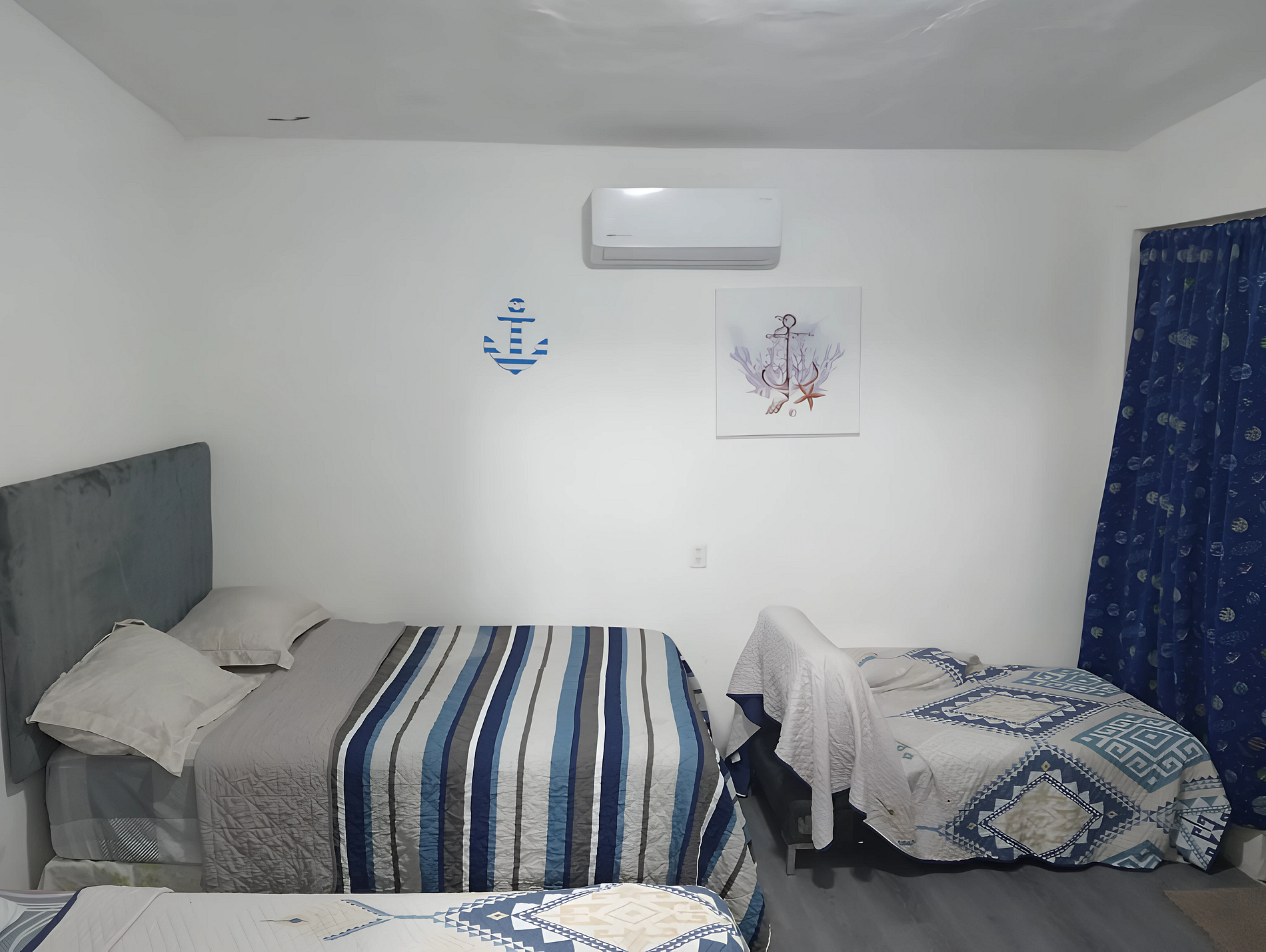 Private room for 4 guests on the second floor, located on a quiet, dead-end street. Features 2 beds, private bathroom, A/C, TV, WiFi, and hot water. Just 200 m from Playa Azul and within walking distance to restaurants, bars, and malls. Ideal for resting in comfort, privacy, and at a fair price.