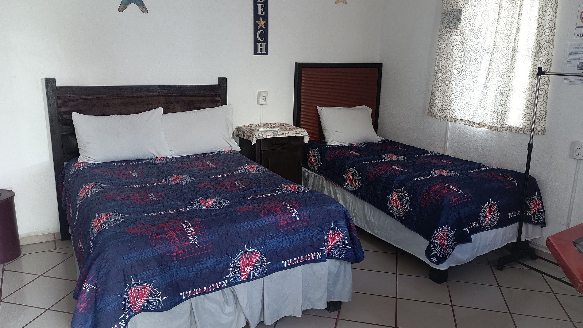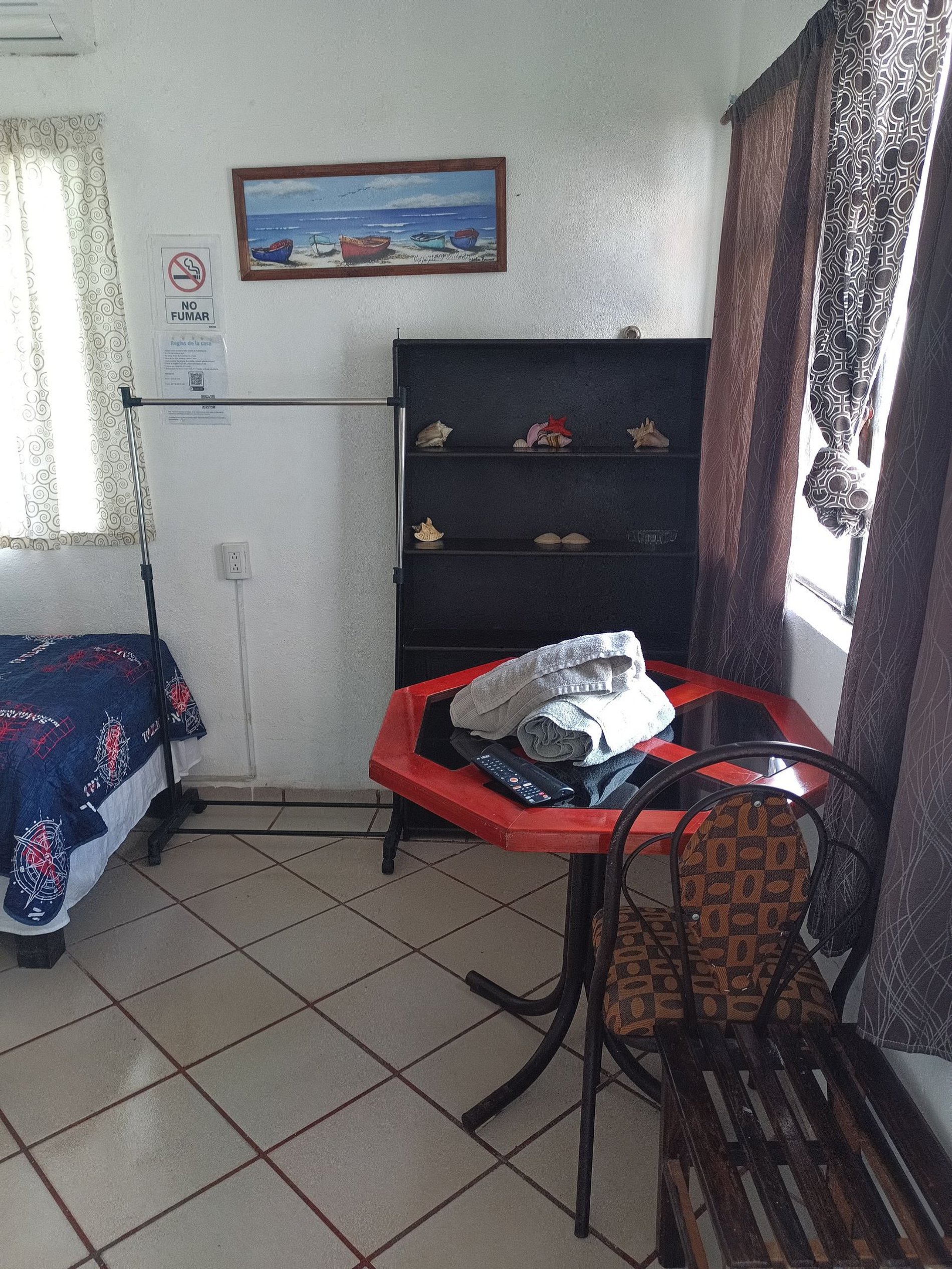Habitación privada para 3 personas en zona tranquila y segura. Cuenta con cama matrimonial, cama individual, baño amplio, aire acondicionado, TV, WiFi y agua caliente. A solo 200 m de Playa Azul y muy cerca del boulevard Miguel de la Madrid, con acceso caminando a restaurantes, bares y plazas. Ideal para descansar con privacidad y sin complicaciones.